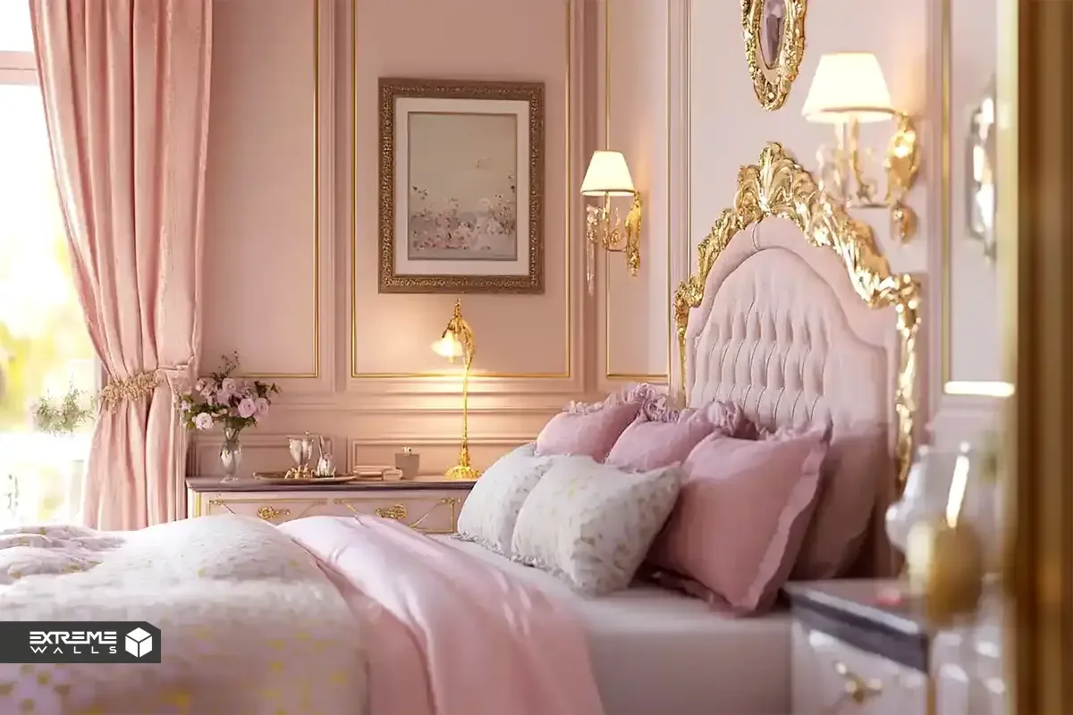 - ترکیب دو رنگ صورتی و طلایی در دکوراسیون اتاق خواب دخترانه: