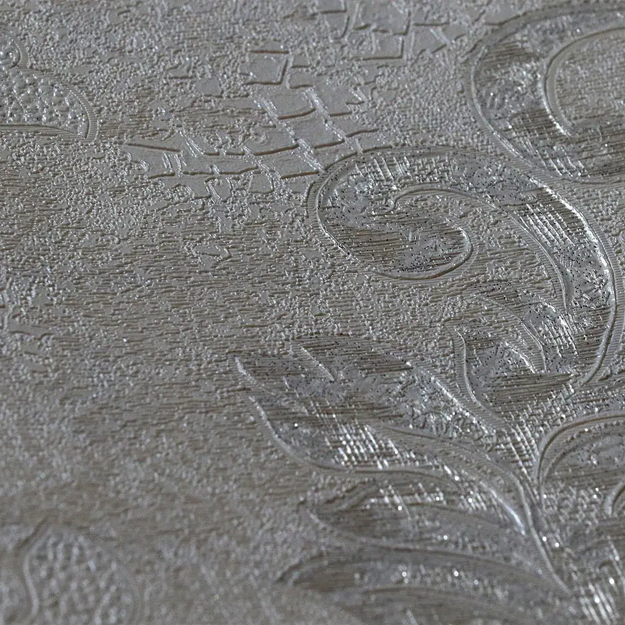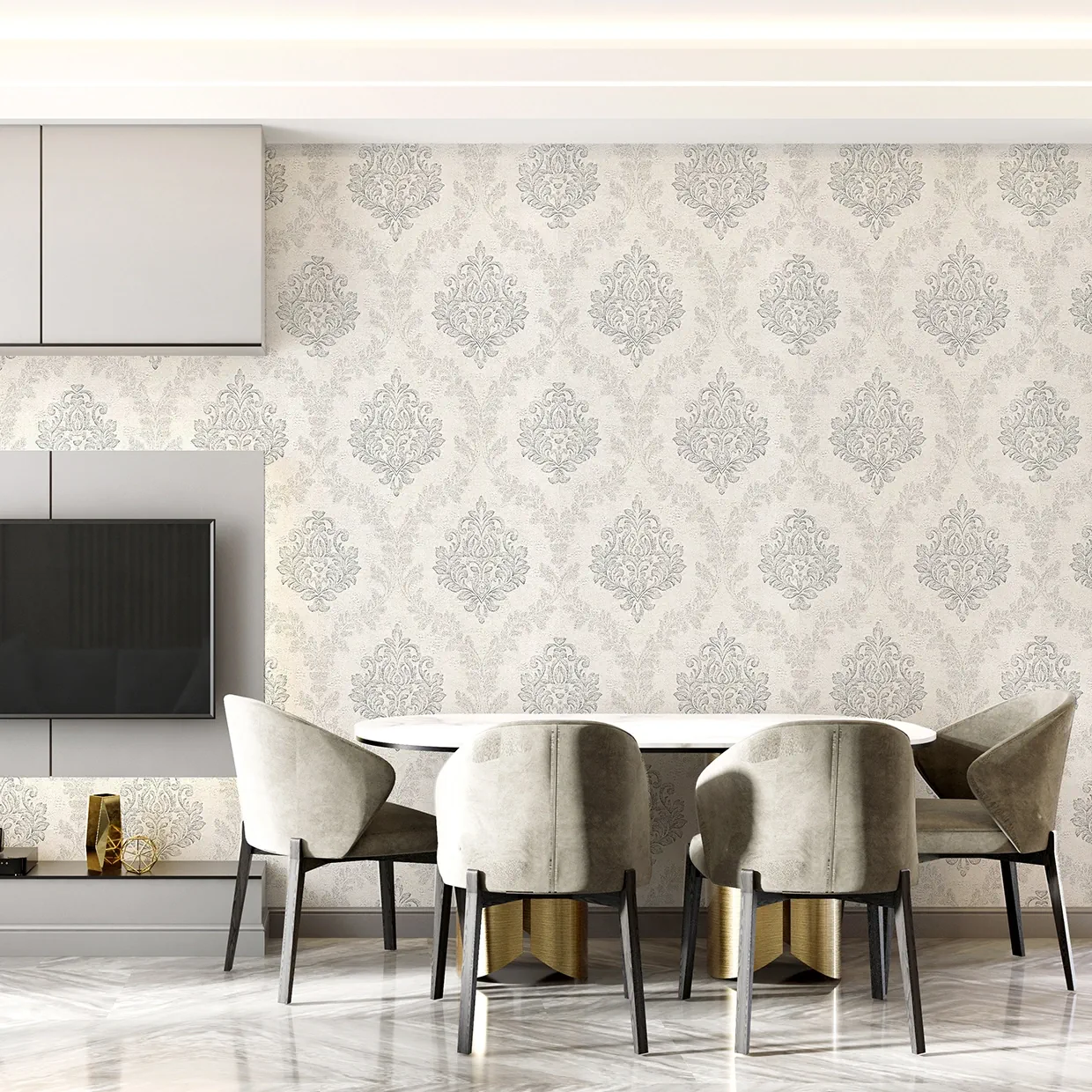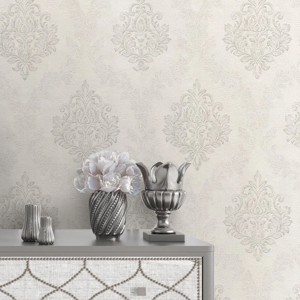 طرحی که در این کاغذ دیواری به کار رفته است، داماسک بوده و رنگی که در این کاغذ دیواری استفاده شده است، سفید و سفید نقرهای میباشد.