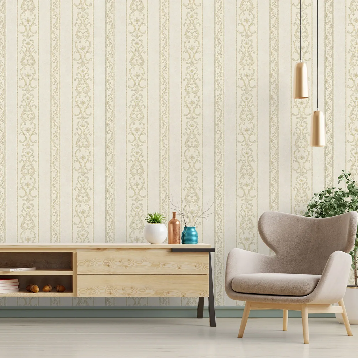 کاغذ دیواری راه راه کد ۳۰۹۹ برای دکوراسیونهایی با سبک کلاسیک طراحی شده است. تناسب رنگی که در طراحی این کاغذ دیواری با کدهای مکمل پوششی شاخص خود دارد، باعث میشود که استفاده ترکیبی از آنها باعث بهتر جلوه دادن دکوراسیون شما شود.