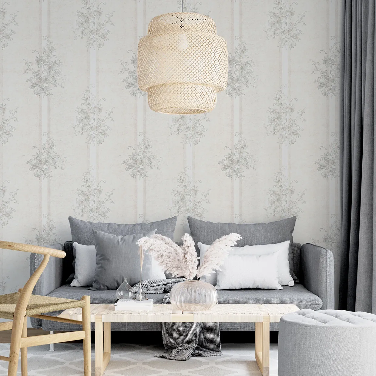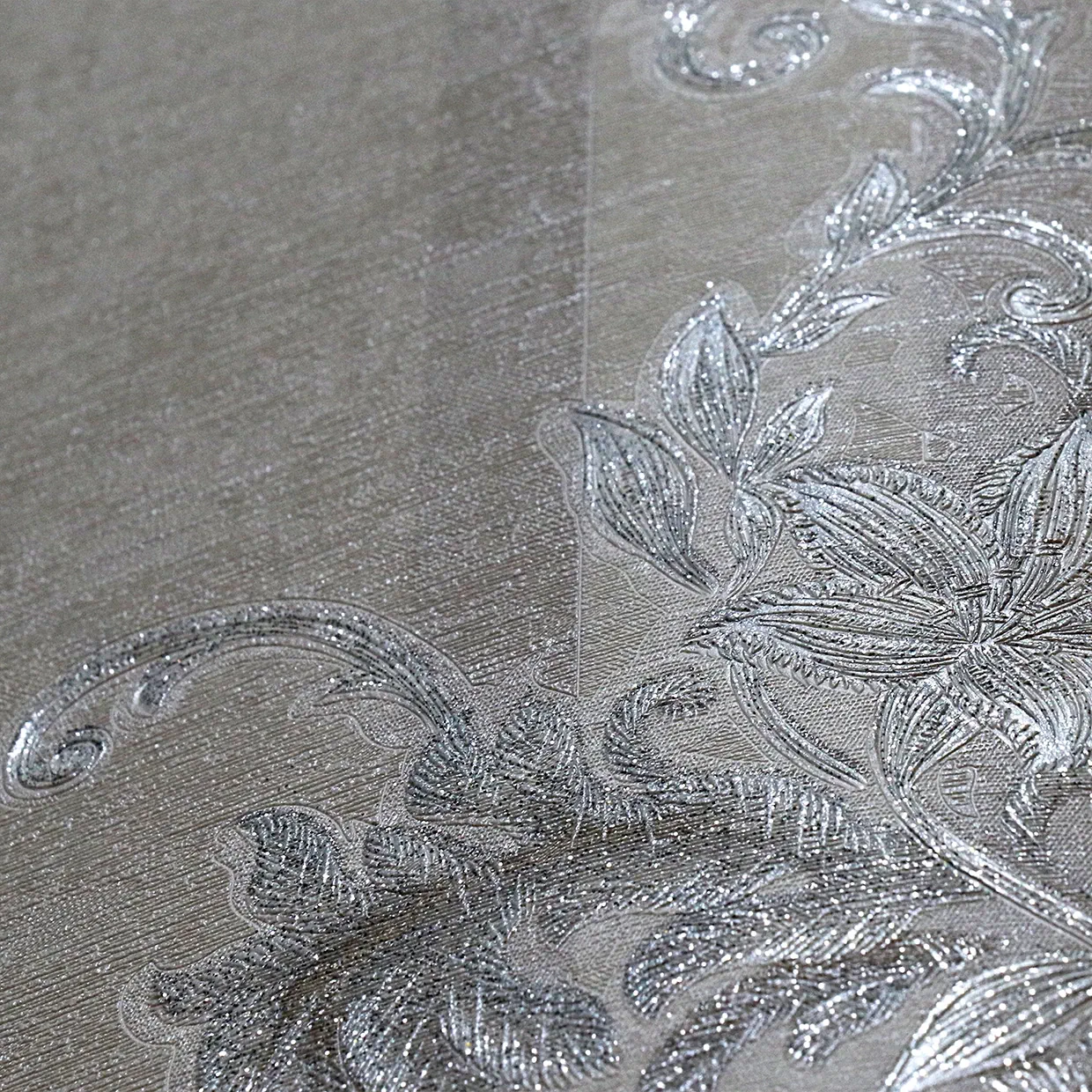طرح روی این کاغذ دیواری طرح گل های برجسته به رنگ سفید خاکستری است. تلفیق این رنگ ها باعث ایجاد طرحی شیک در این کاغذ دیواری شده است.