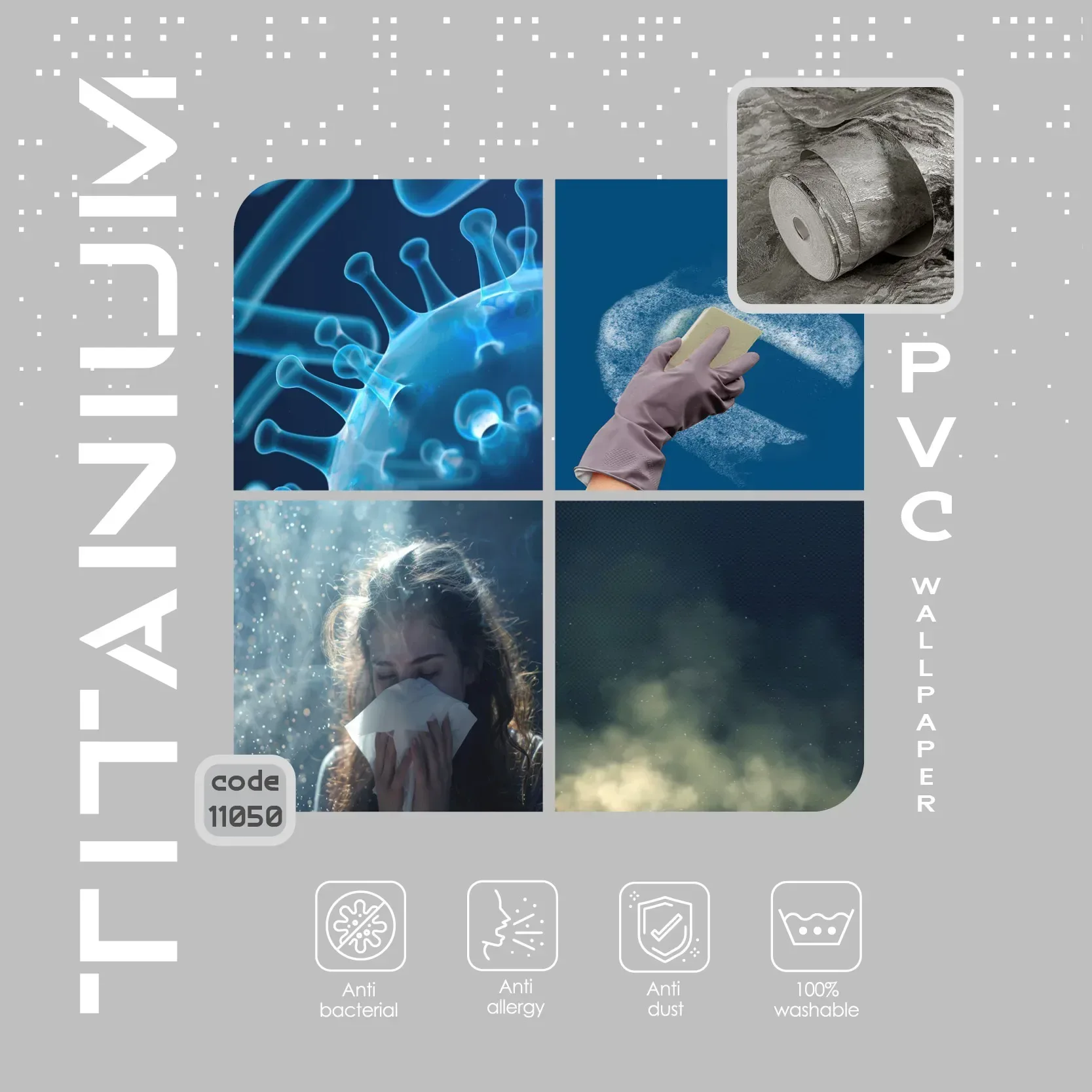 این محصول از جنس PVC (وینیل) ساخته میشود، قابلیتی که کاغذ دیواریهای PVC (وینیل) دارند دوام بالا و قابلیت شستشوی آنهاست. داشتن یک لایه زیرین، یک لایه فیبر یا کاغذ در میان و یک لایه پوشش نهایی باعث دوام بالای این دسته از کاغذ دیواریها میشود.