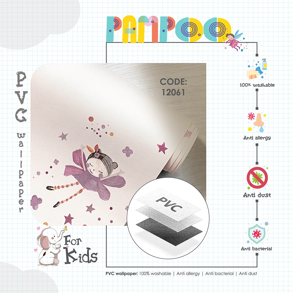آلبوم کاغذ دیواری کودک پمپو، مجموعهای صد در صد وینیل (PVC)، قابل شستشو، ضد حساسیت (آنتی آلرژی)، ضد گرد و غبار (آنتی داست)، و مقاوم و بادوام در برابر انواع لکهها و آسیبهاست؛