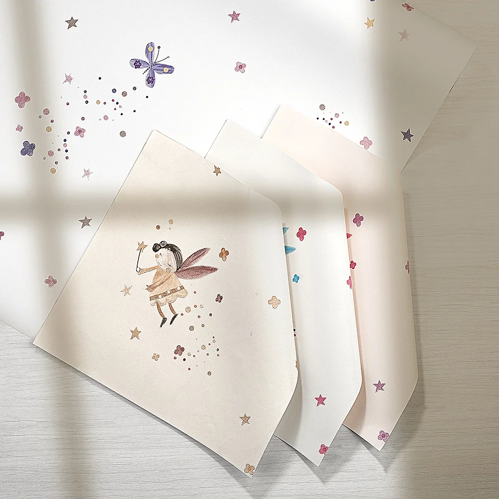 کاغذ دیواری کودک کد 12058 با پس زمینهای سفید و روشن، بوم پاک و آرامی برای نقشهای فانتزی و کودکانه فراهم کرده است؛ روی این پس زمینه، پریهای کوچک با لباسها و بالهای رنگی در حال پروازند، هر کدام از آنها یک چوب جادویی در دست دارند که گویی در حال پاشیدن دانههای رنگی و ستارههای براق در هوا هستند. این پریهای مهربان در فاصلههای منظم روی دیوار پراکنده شدهاند و فضایی افسانهای و خیالانگیز برای کودک میسازند. در کنار پریها، پروانهها و سنجاقکهای رنگی نیز قرار گرفتهاند که با مسیر نقطهچینهای رنگی، حال و هوای پرواز و جنبوجوش را به طرح اضافه میکنند. همچنین، ستارهها و گلهای ریز پنجپر سطح دیوار را پر کرده و حالتی شاد و پرانرژی را به این کاغذ دیواری کودک بخشیدهاند.