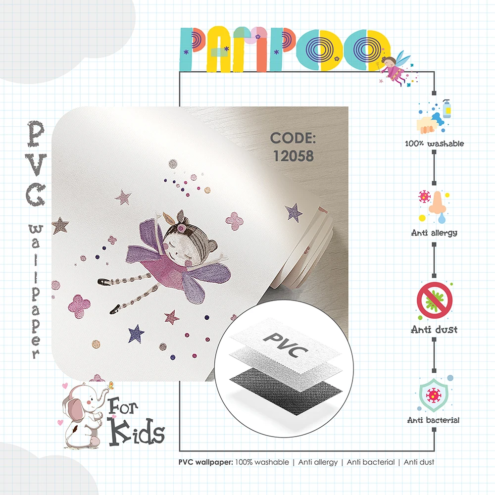 آلبوم کاغذ دیواری کودک پمپو، مجموعهای صد در صد وینیل (PVC)، قابل شستشو، ضد حساسیت (آنتی آلرژی)، ضد گرد و غبار (آنتی داست)، و مقاوم و بادوام در برابر انواع لکهها و آسیبهاست؛