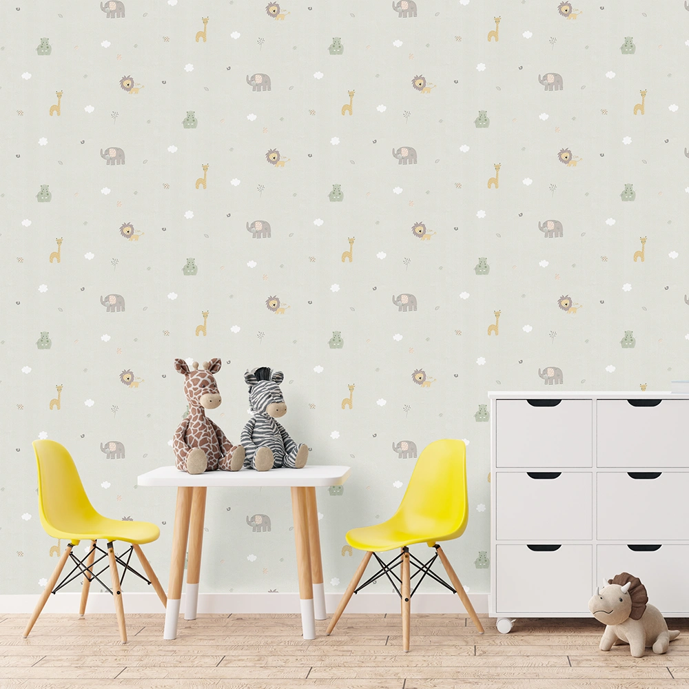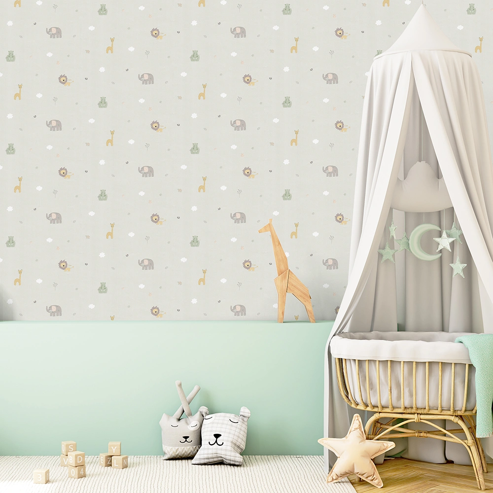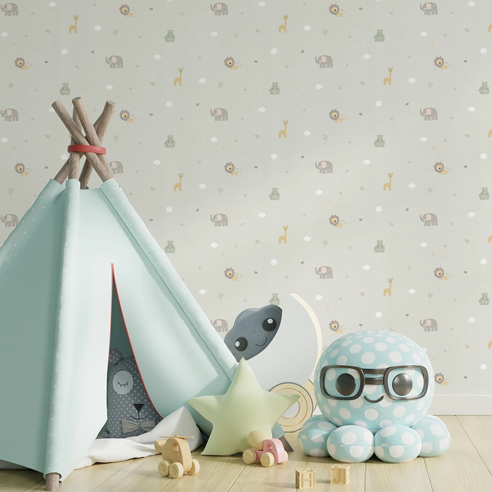 کاغذ دیواری کودک کد 12065 یکی از شیرینترین و دلنشینترین طرحهای آلبوم پمپو است؛ این کاغذ دیواری بچگانه با پس زمینه سبز پاستلی و ملایم، اتاق کودک را بزرگتر، روشن و دلبازتر نشان میدهد. روی این زمینهی آرام و کمرنگ، حیوانات دوستداشتنی جنگل مثل شیرهای کوچک و بامزه با یالهای رنگی و روشن، فیلهای کوچک با بدن و گوشهای طرحدار، زرافههایی با خالهای ریز و اسب آبیهای خندان به صورت پراکنده قرار گرفتهاند. در کنار این حیوانات، جزییات ریزی مثل ابرهای سفید، برگهای کوچک، شاخههای نازک و گلهای ساده و ظریف، حال و هوایی پر از لطافت و خیالپردازی را به طرح میافزایند. ترکیب این عناصر، حس یک دنیای کوچک و داستانی را برای کودک تداعی میکند، گویی دیوارها به صفحهای از یک کتاب مصور کودکانه تبدیل شدهاند.