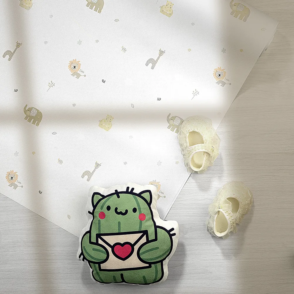 کاغذ دیواری کودک کد 12067 با پسزمینهی سفید و روشن، فضایی دلباز و پرنور برای اتاق کودک ایجاد میکند. روی این زمینه ساده و آرام، حیوانات بامزهی جنگل مثل شیرهای کوچک با یالهای رنگی، فیلهای خندان با گوشهای طرحدار، زرافههای ریزنقش و اسب آبیهای شیرین به چشم میخورند. در کنار آنها، ابرهای لطیف، برگها و گلهای کوچک قرار گرفتهاند که به این طراحی حال و هوایی شاد، داستانی و خیالانگیز میبخشند.