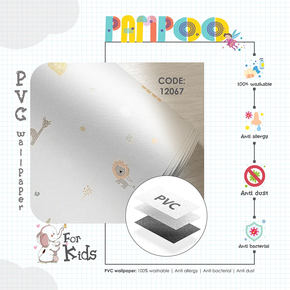 آلبوم کاغذ دیواری کودک پمپو، مجموعهای صد در صد وینیل (PVC)، قابل شستشو، ضد حساسیت (آنتی آلرژی)، ضد گرد و غبار (آنتی داست)، و مقاوم و بادوام در برابر انواع لکهها و آسیبهاست؛