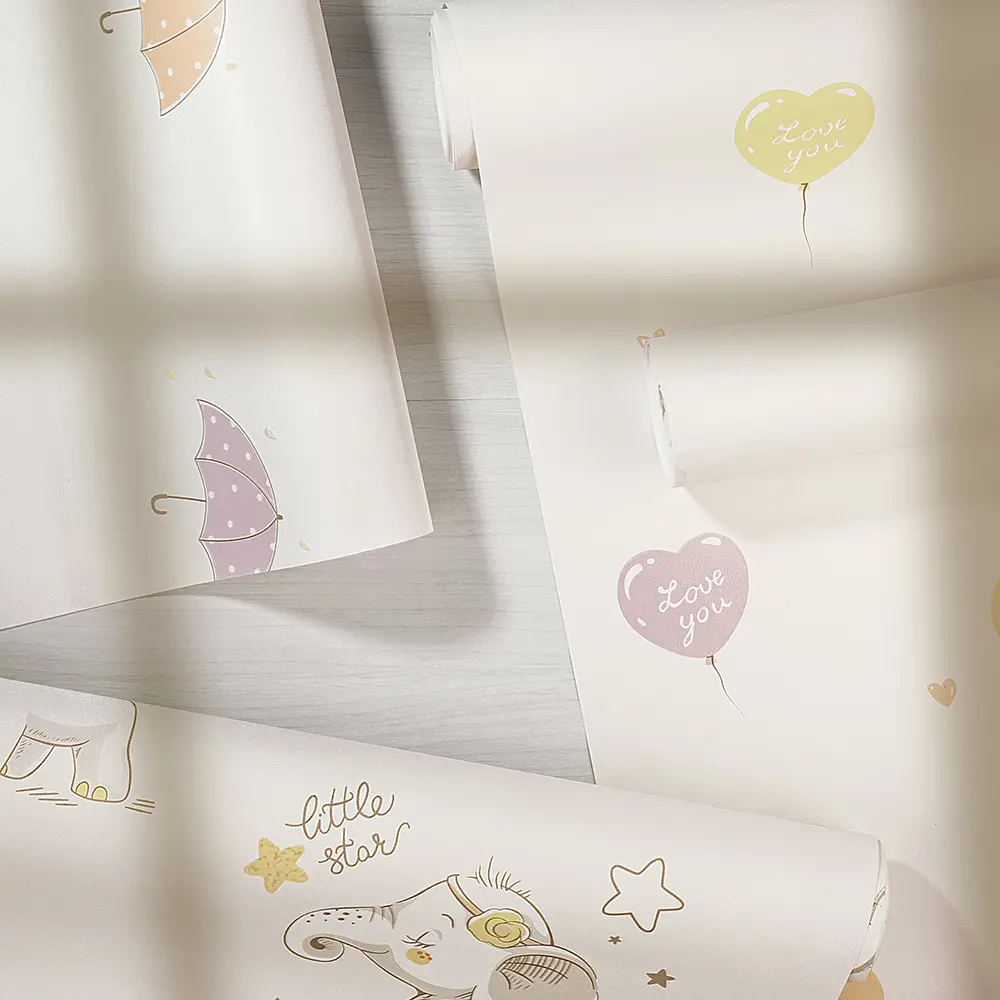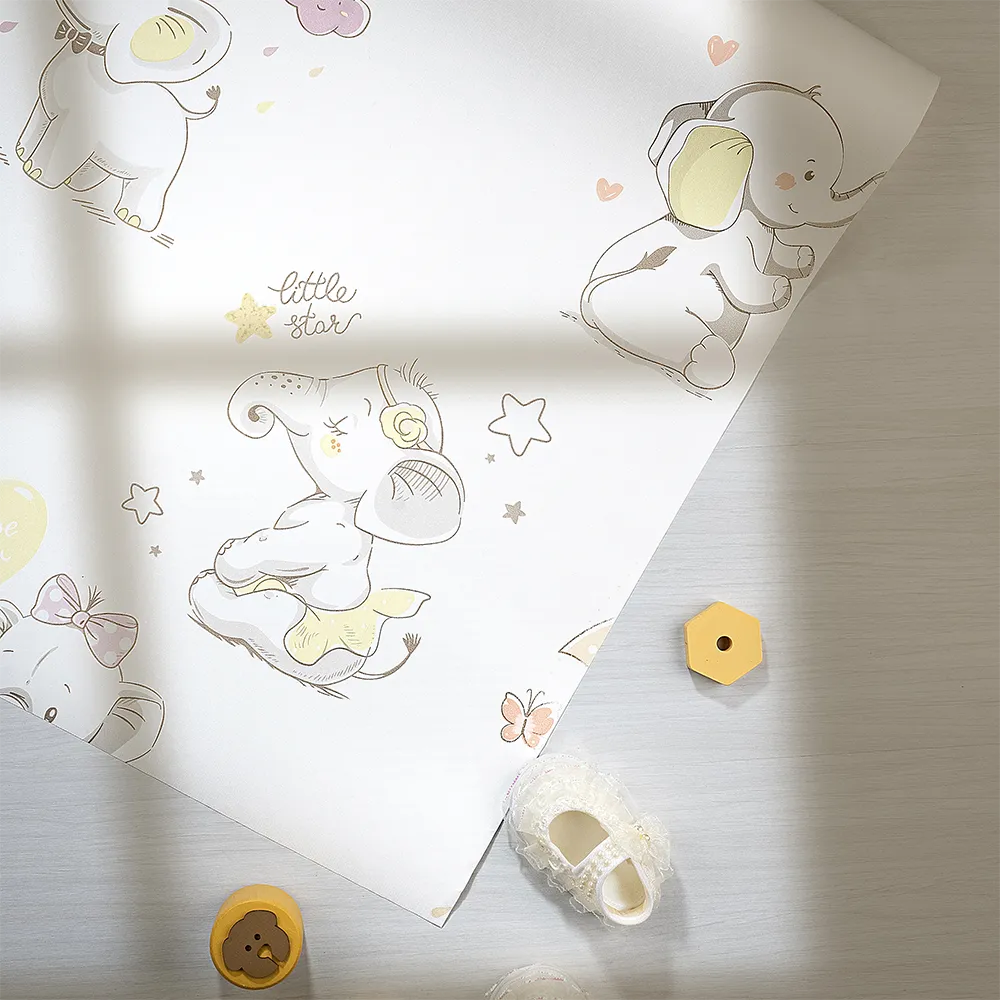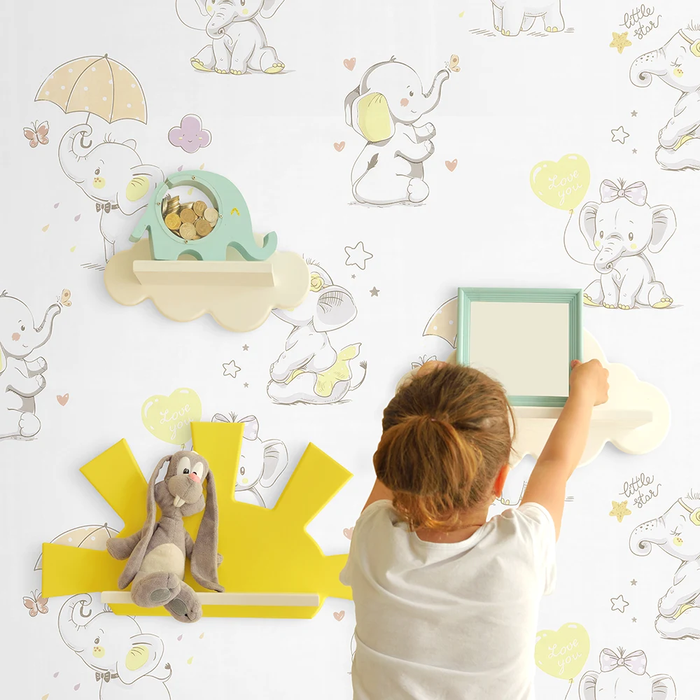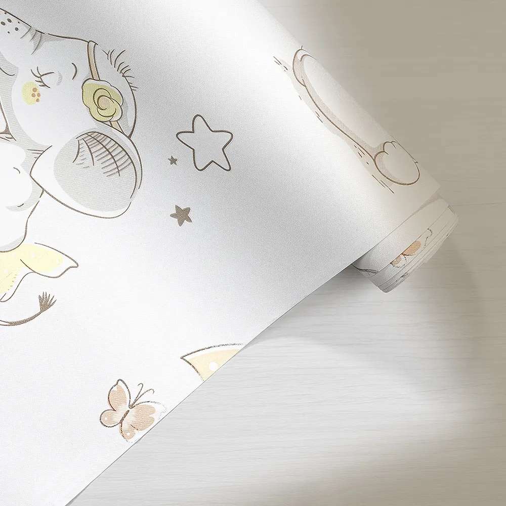 این کاغذ دیواری کودک با پس زمینهای سفید و روشن، فضایی مملو از آرامش را در اتاق خلق میکند!