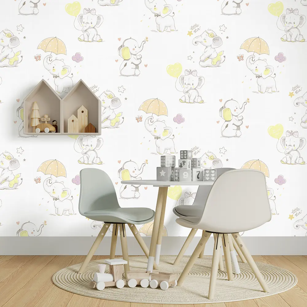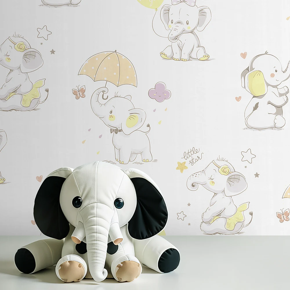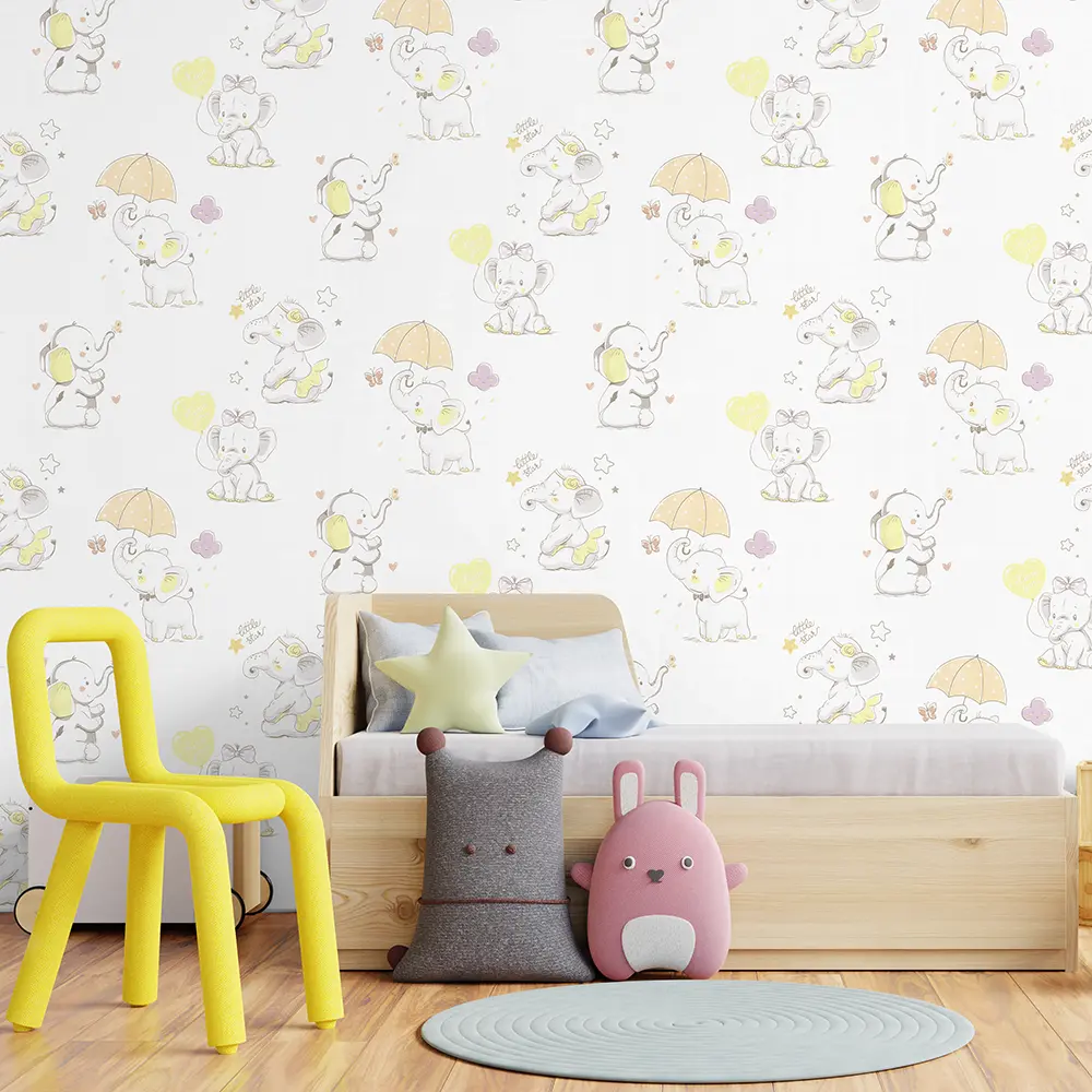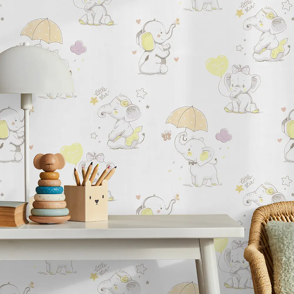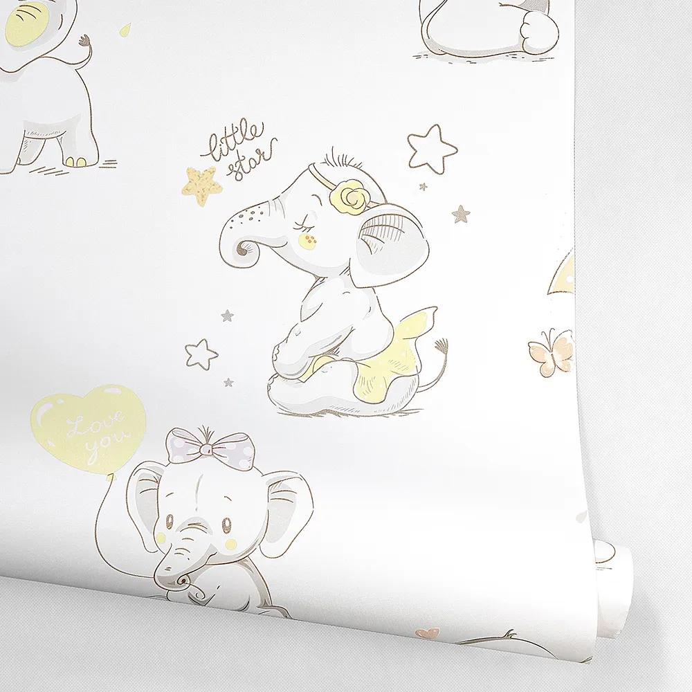 کاغذ دیواری کودک طرح فیل های کوچک | سفید لیمویی کد 12009