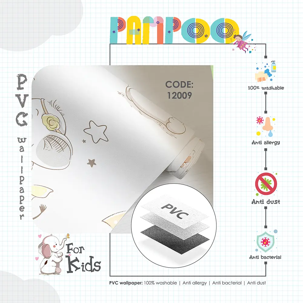 آلبوم کاغذ دیواری کودک پمپو، مجموعهای صد در صد وینیل (PVC)، قابل شستشو، ضد حساسیت (آنتی آلرژی)، ضد گرد و غبار (آنتی داست)، و مقاوم و بادوام در برابر انواع لکهها و آسیبهاست؛
