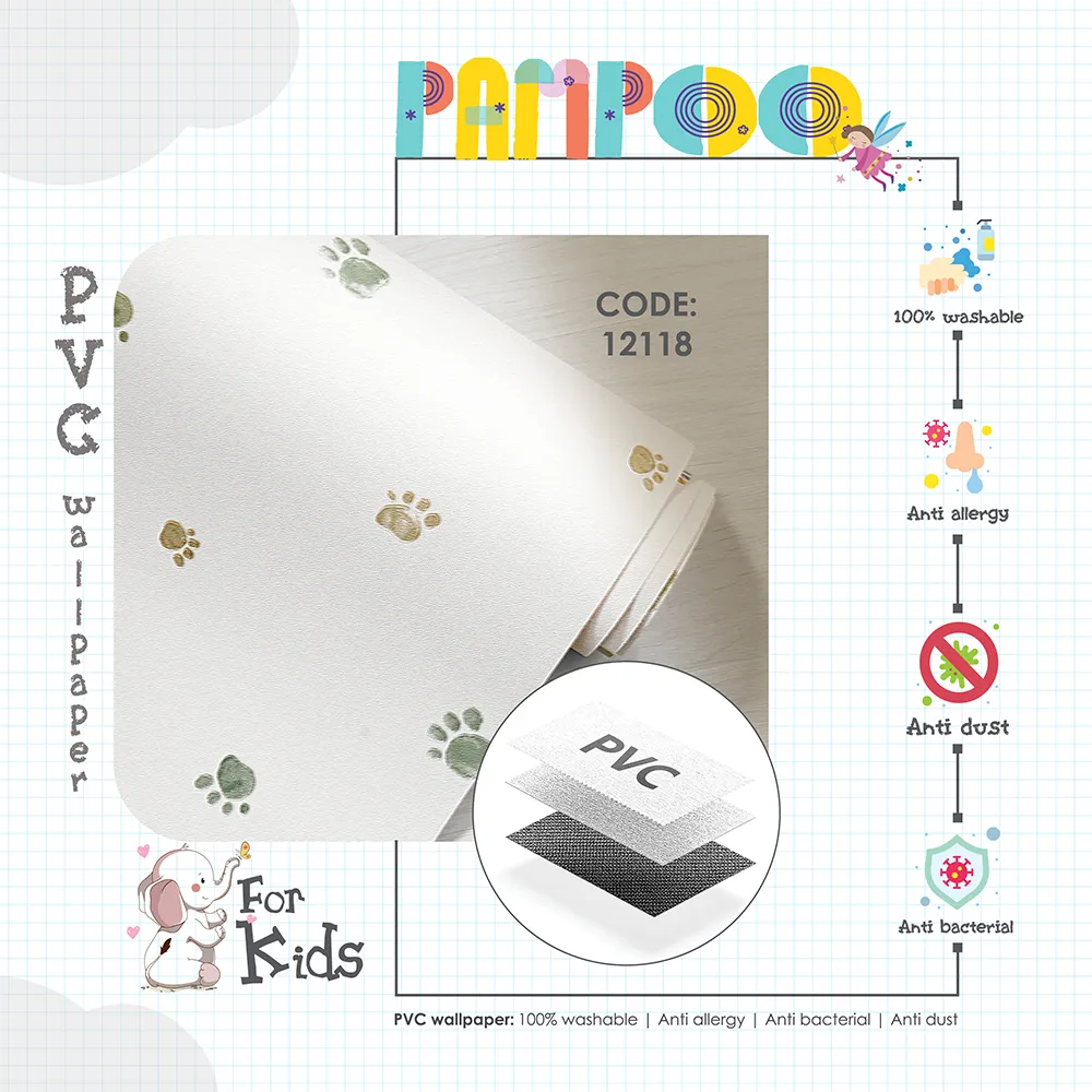 آلبوم کاغذ دیواری کودک پمپو، مجموعهای صد در صد وینیل (PVC)، قابل شستشو، ضد حساسیت (آنتی آلرژی)، ضد گرد و غبار (آنتی داست)، و مقاوم و بادوام در برابر انواع لکهها و آسیبهاست؛