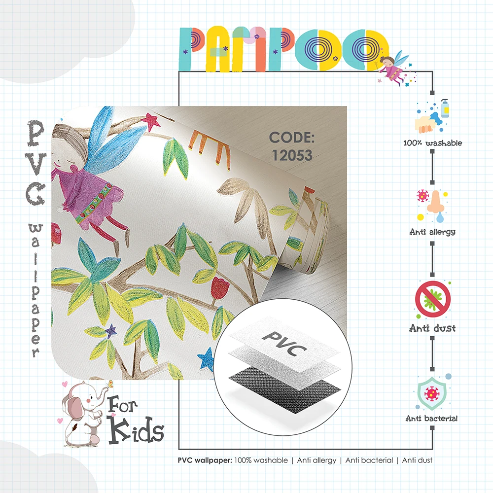 آلبوم کاغذ دیواری کودک پمپو، مجموعه‌ای صد در صد وینیل (PVC)، قابل شستشو، ضد حساسیت (آنتی آلرژی)، ضد گرد و غبار (آنتی داست)، و مقاوم و بادوام در برابر انواع لکه‌ها و آسیب‌هاست؛