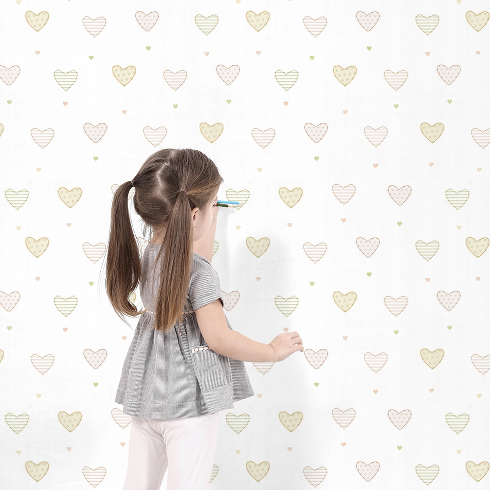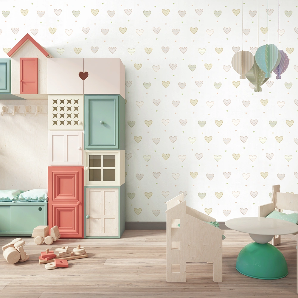 کاغذ دیواری کودک کد 12092 با زمینهی سفید شیری و قلبهای کوچک و بزرگ رنگی، فضایی مملو از نشاط و آرامش را در اتاق کودک به ارمغان میآورد. قلبهای بزرگتر با طرح خال خالی و راه راه در رنگهای ملایم سبز و صورتی طراحی شدهاند و در میان آنها قلبهای کوچکتر به رنگهای صورتی روشن و سبز پراکندهاند. این تکرار دلنشین و ملایم باعث میشود اتاق کودک حال و هوایی پر از مهربانی، لطافت و صمیمیت پیدا کند.