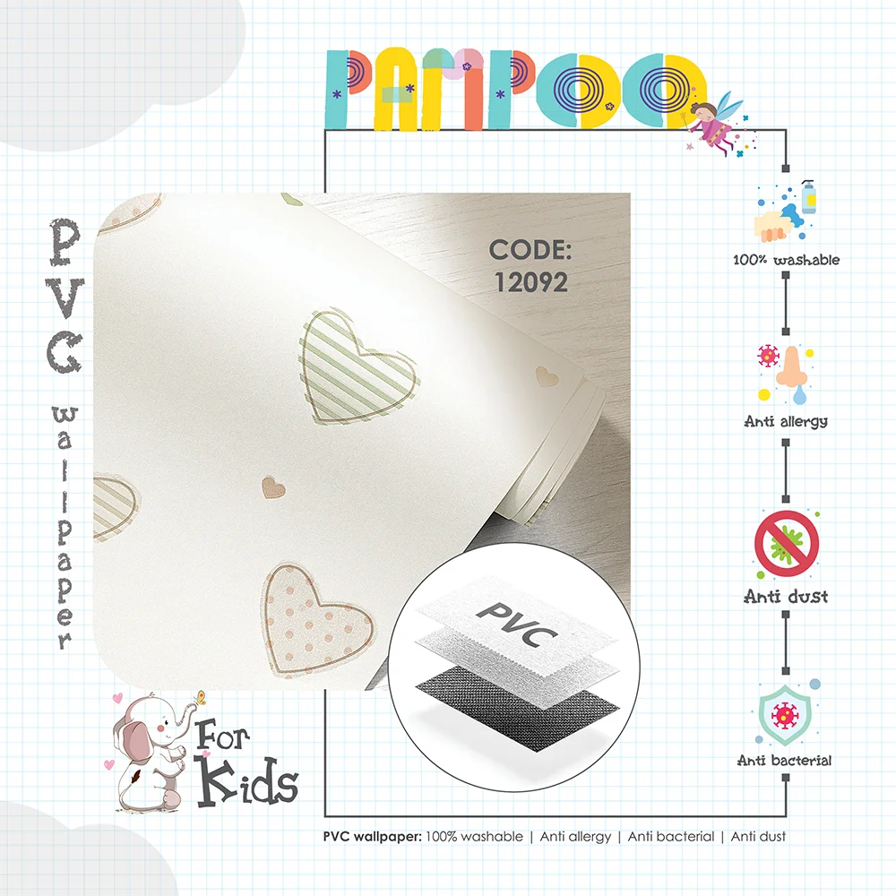 آلبوم کاغذ دیواری کودک پمپو، مجموعهای صد در صد وینیل (PVC)، قابل شستشو، ضد حساسیت (آنتی آلرژی)، ضد گرد و غبار (آنتی داست)، و مقاوم و بادوام در برابر انواع لکهها و آسیبهاست؛