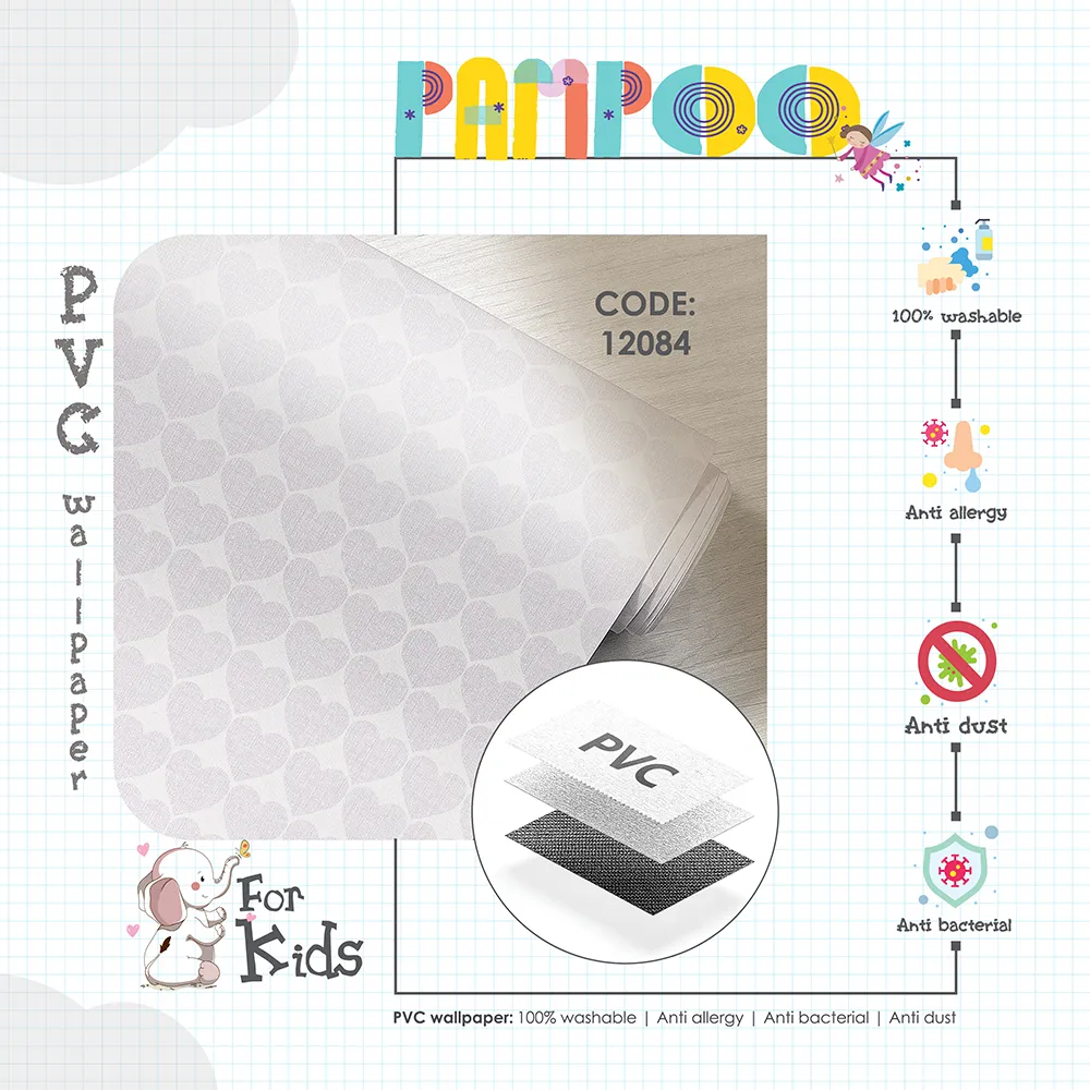 آلبوم کاغذ دیواری کودک پمپو، مجموعهای صد در صد وینیل (PVC)، قابل شستشو، ضد حساسیت (آنتی آلرژی)، ضد گرد و غبار (آنتی داست)، و مقاوم و بادوام در برابر انواع لکهها و آسیبهاست؛