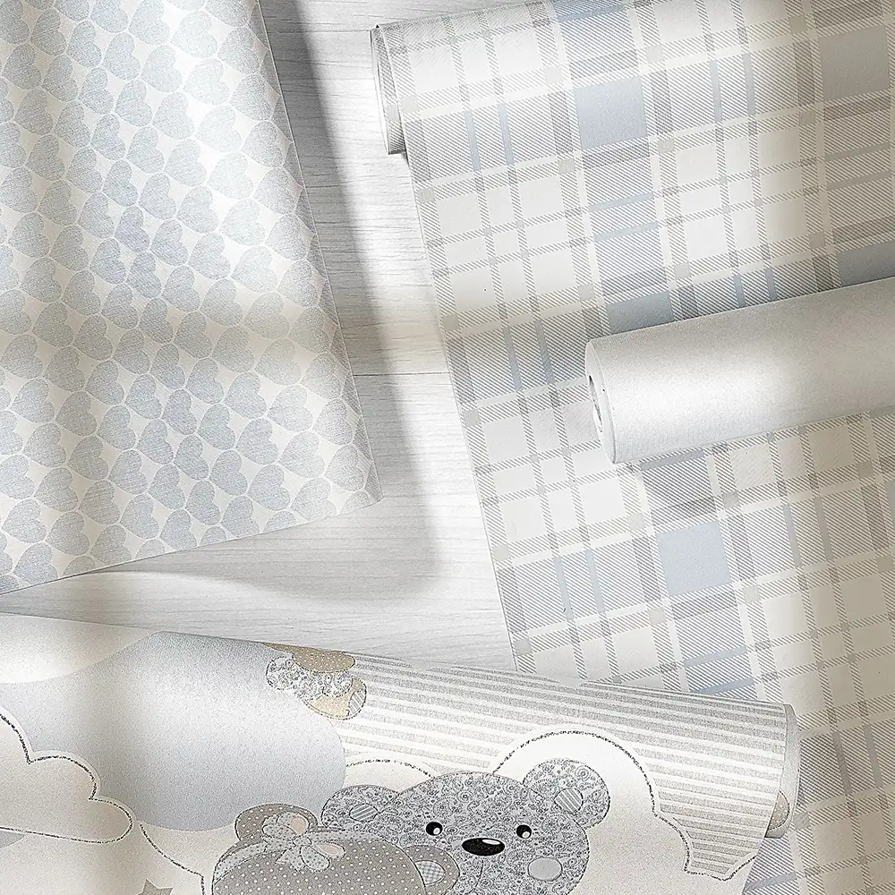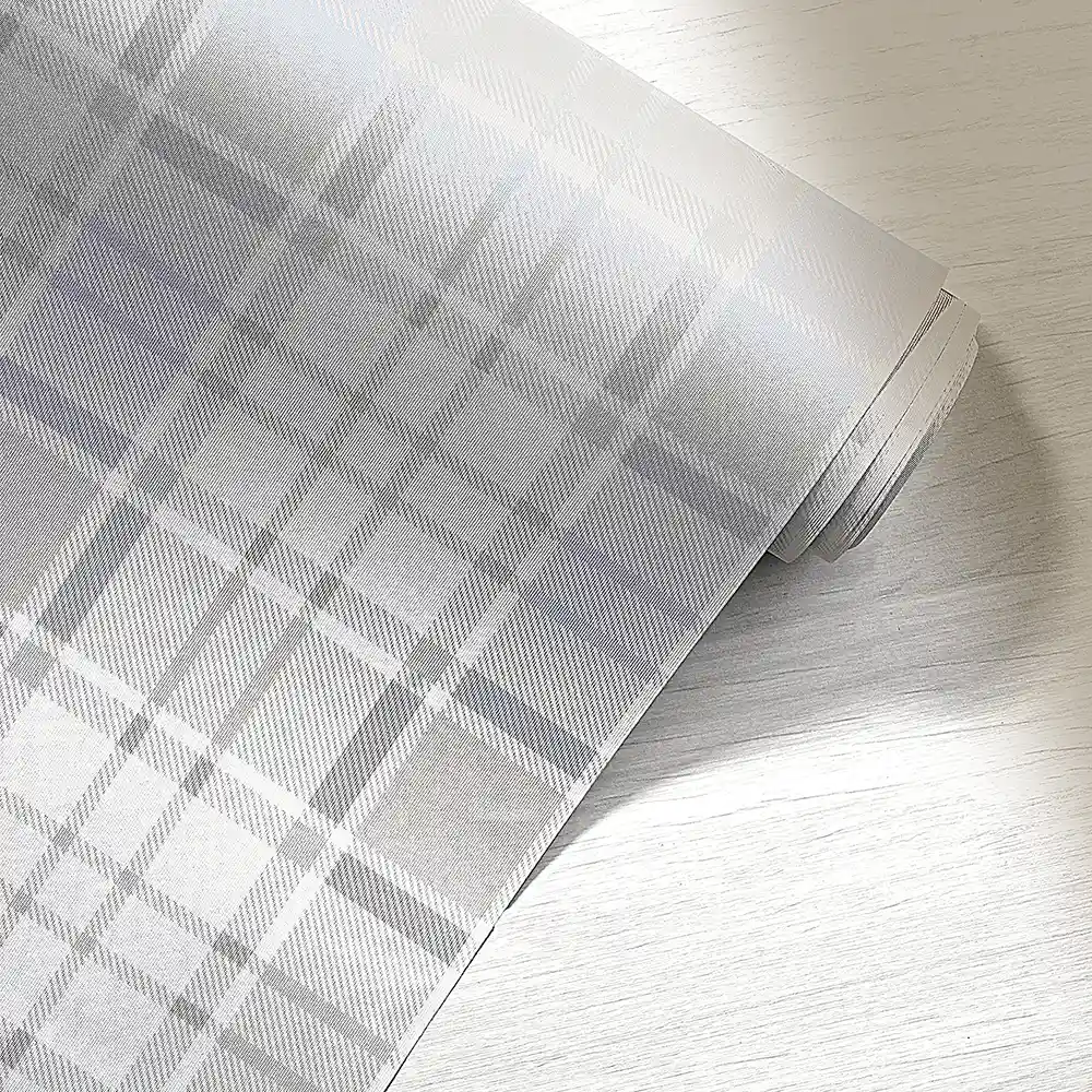 نقش چهارخانهها به صورت لایهای و بافتدار کار شده، بهطوری که حس پارچهای نرم و لطیف را تداعی میکند. نظم و تکرار الگو باعث میشود فضا مرتبتر به نظر برسد و در عین حال رنگهای ملایم آن برای اتاق کودک، بهخصوص در دکوراسیونهایی با تم آرام و خنثی، انتخابی هماهنگ و دلنشین باشد.