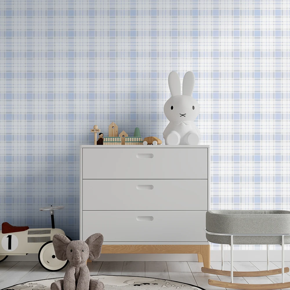 کاغذ دیواری کودک کد 12079 با طرح چهارخونه کلاسیک طراحی شده که پایه اصلی آن سفید است و خطوط و مربعهای منظم به رنگ آبی ملایم و آسمانی روی آن نقش بستهاند؛ ترکیب رنگ سفید و آبی حس خنکی، پاکی و آرامش را به فضا میدهد و حضور خاکستری در خطوط، تعادل بصری ایجاد کرده و طرح را از یکنواختی خارج میکند.
