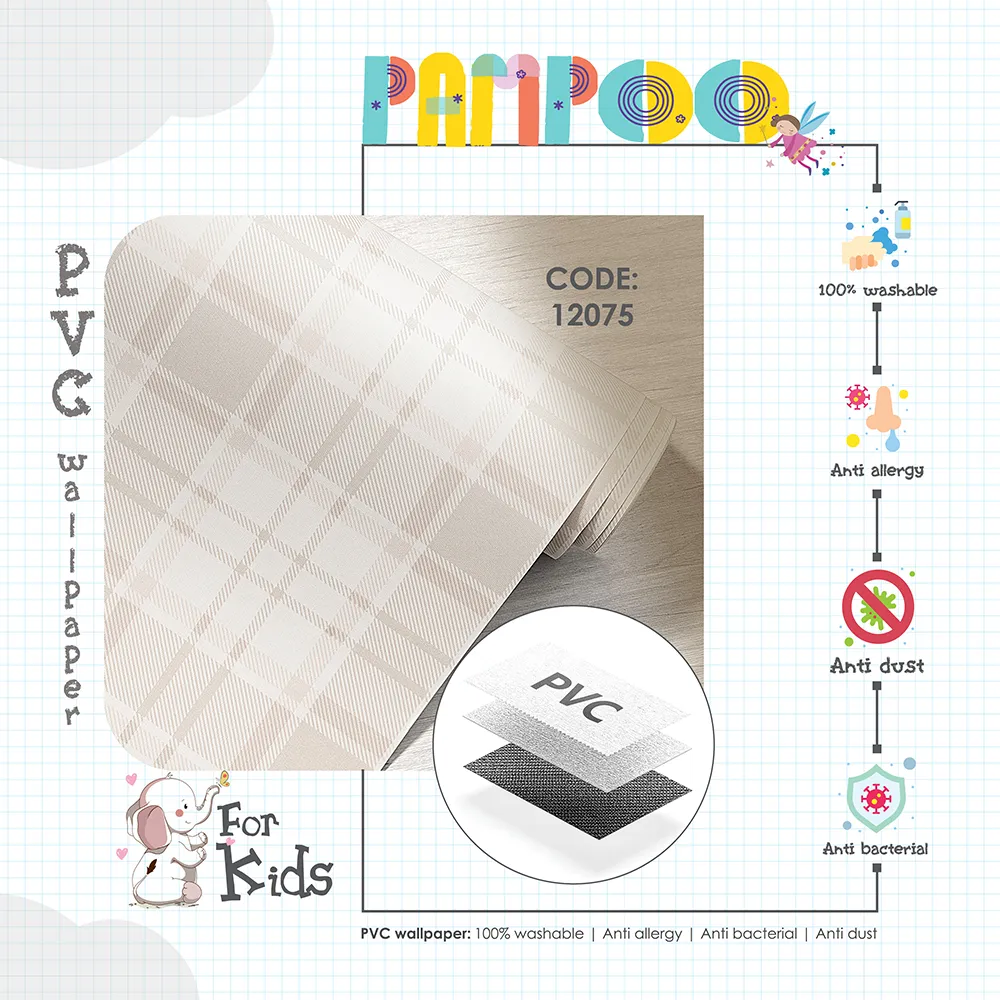 آلبوم کاغذ دیواری کودک پمپو، مجموعهای صد در صد وینیل (PVC)، قابل شستشو، ضد حساسیت (آنتی آلرژی)، ضد گرد و غبار (آنتی داست)، و مقاوم و بادوام در برابر انواع لکهها و آسیبهاست؛