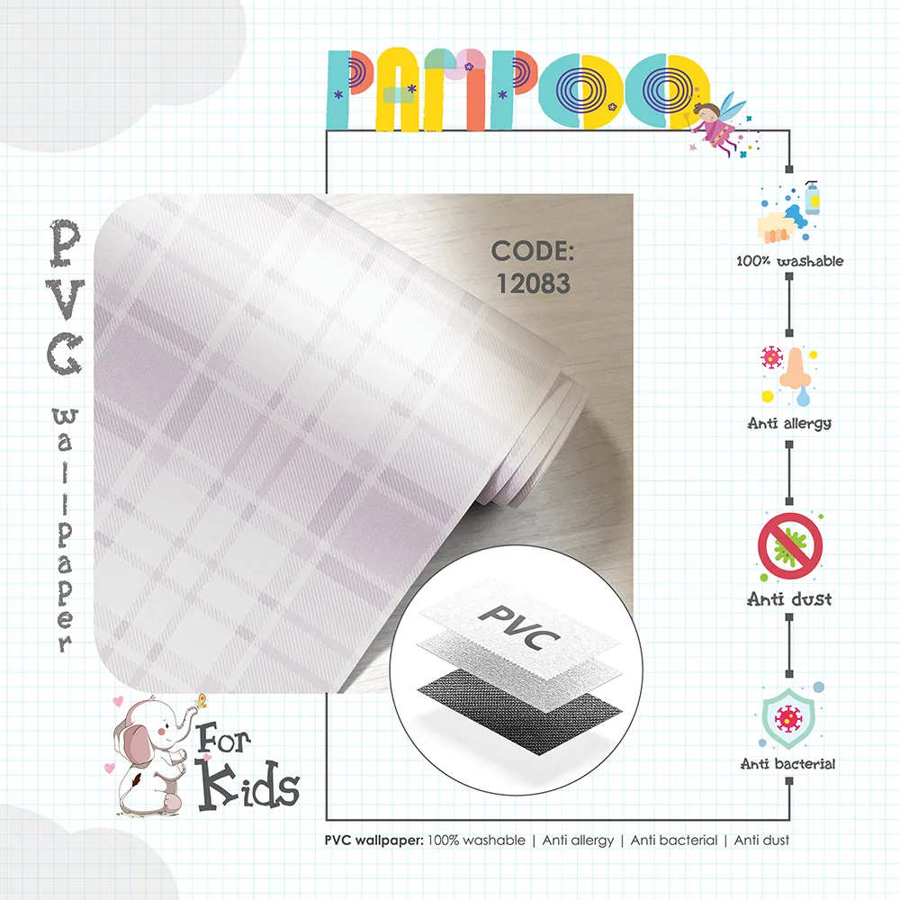 آلبوم کاغذ دیواری کودک پمپو، مجموعهای صد در صد وینیل (PVC)، قابل شستشو، ضد حساسیت (آنتی آلرژی)، ضد گرد و غبار (آنتی داست)، و مقاوم و بادوام در برابر انواع لکهها و آسیبهاست؛