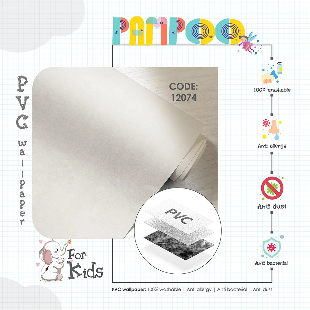 آلبوم کاغذ دیواری کودک پمپو، مجموعه‌ای صد در صد وینیل (PVC)، قابل شستشو، ضد حساسیت (آنتی آلرژی)، ضد گرد و غبار (آنتی داست)، و مقاوم و بادوام در برابر انواع لکه‌ها و آسیب‌هاست؛