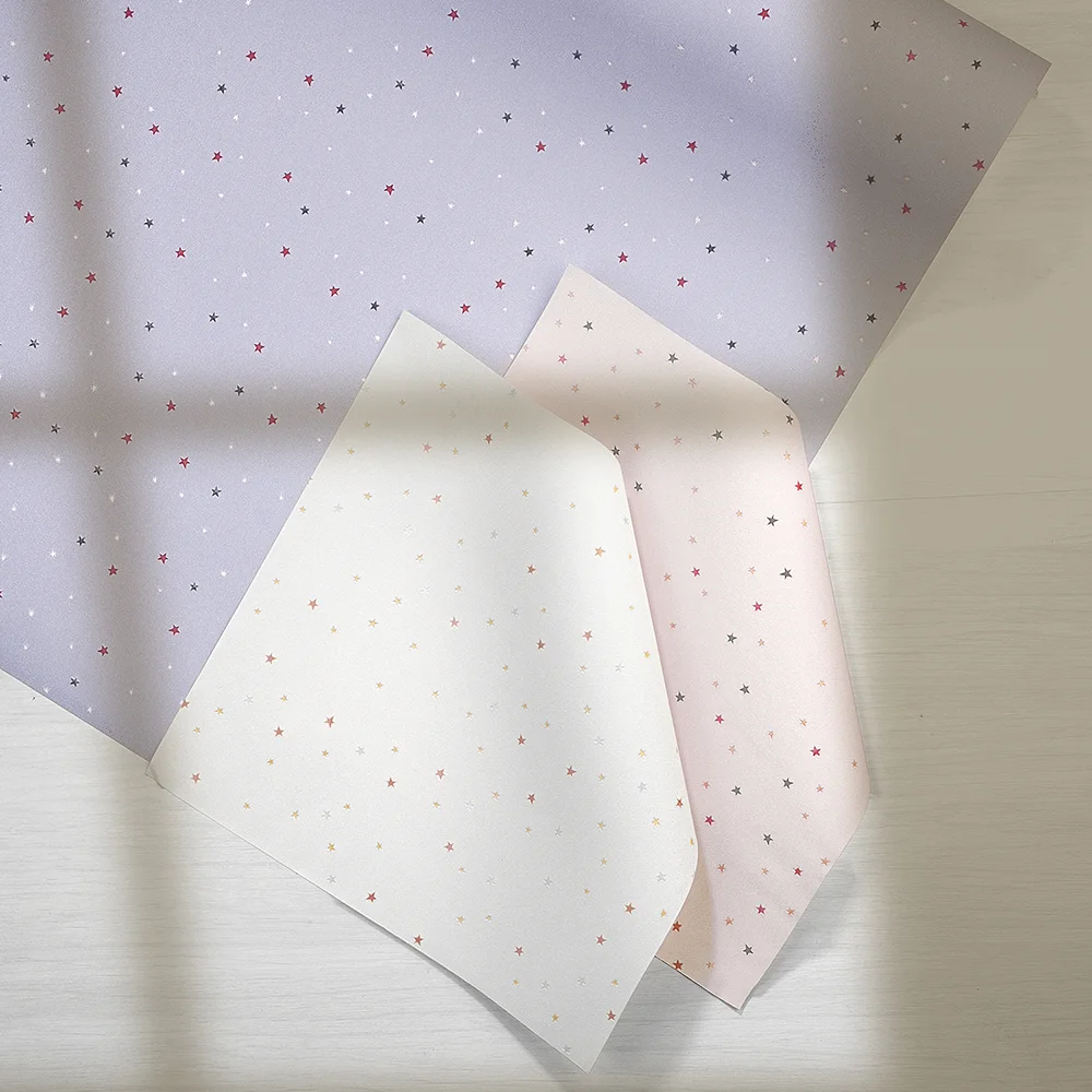 کاغذ دیواری کودک کد 12019 با پس زمینه یاسی روشن و بافت ظریف خود، آرامش و ملایمت خاصی به فضا می‌بخشد؛ اما چیزی که این طرح را متمایز می‌کند حضور ستاره‌های کوچک سفید، صورتی و مشکی فراوانی است که مثل نقطه‌های درخشان روی این پس زمینه پاستلی پخش شده‌اند. این ترکیب ساده و در عین حال فانتزی، حال و هوای شبی پر ستاره را در اتاق تداعی کرده و می‌تواند انتخابی عالی برای اتاق کودک یا نوجوان محسوب ‌شود. رنگ‌های ملایم ستاره‌ها باعث می‌شوند که فضا هم دلنشین و هم پرانرژی باشد، بدون اینکه چشم را خسته کند.