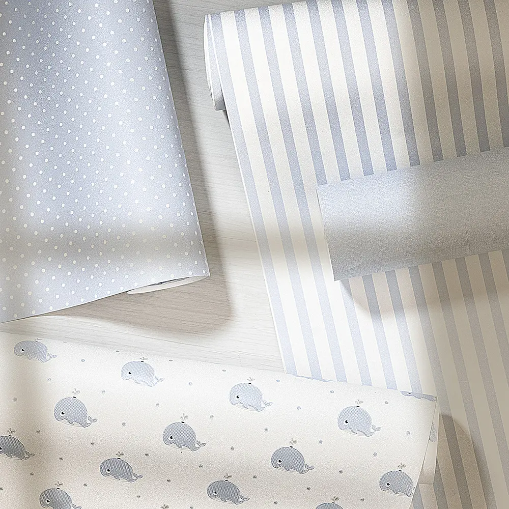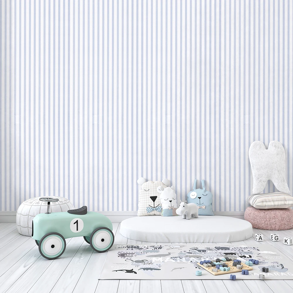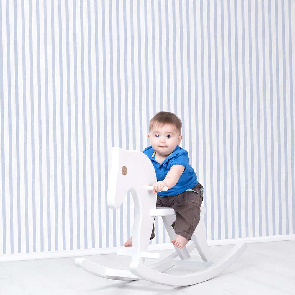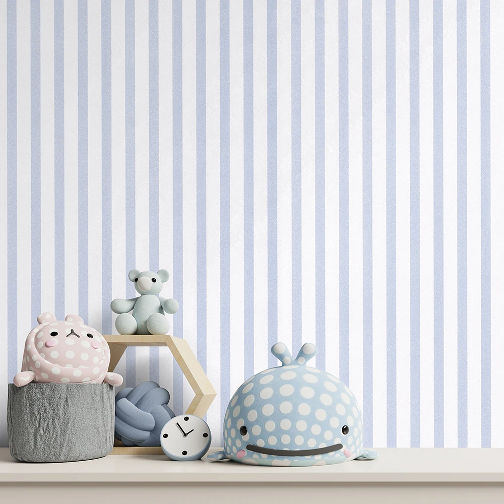 کاغذ دیواری بچگانه کد 12039 از آلبوم پمپو، طرحی راه راه و کلاسیک با ظاهری شیک و مینیمال در اتاق کودک ارائه میدهد. پس زمینهی سفید با راه راههای عمودی آبی آسمانی بسیار کمرنگ، فضایی روشن و دلباز ایجاد کرده و به اتاق کودک حس نظم و آرامش بیشتری میبخشد. همچنین راه راههای سفید و آبی این کاغذ دیواری، ارتفاع بصری ایجاد کرده و سقف اتاق را نیز بلندتر نشان میدهند.