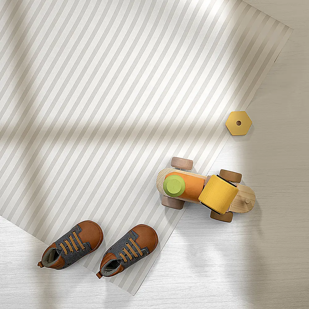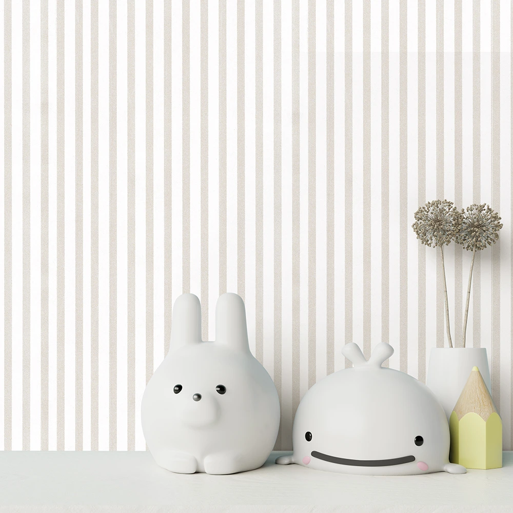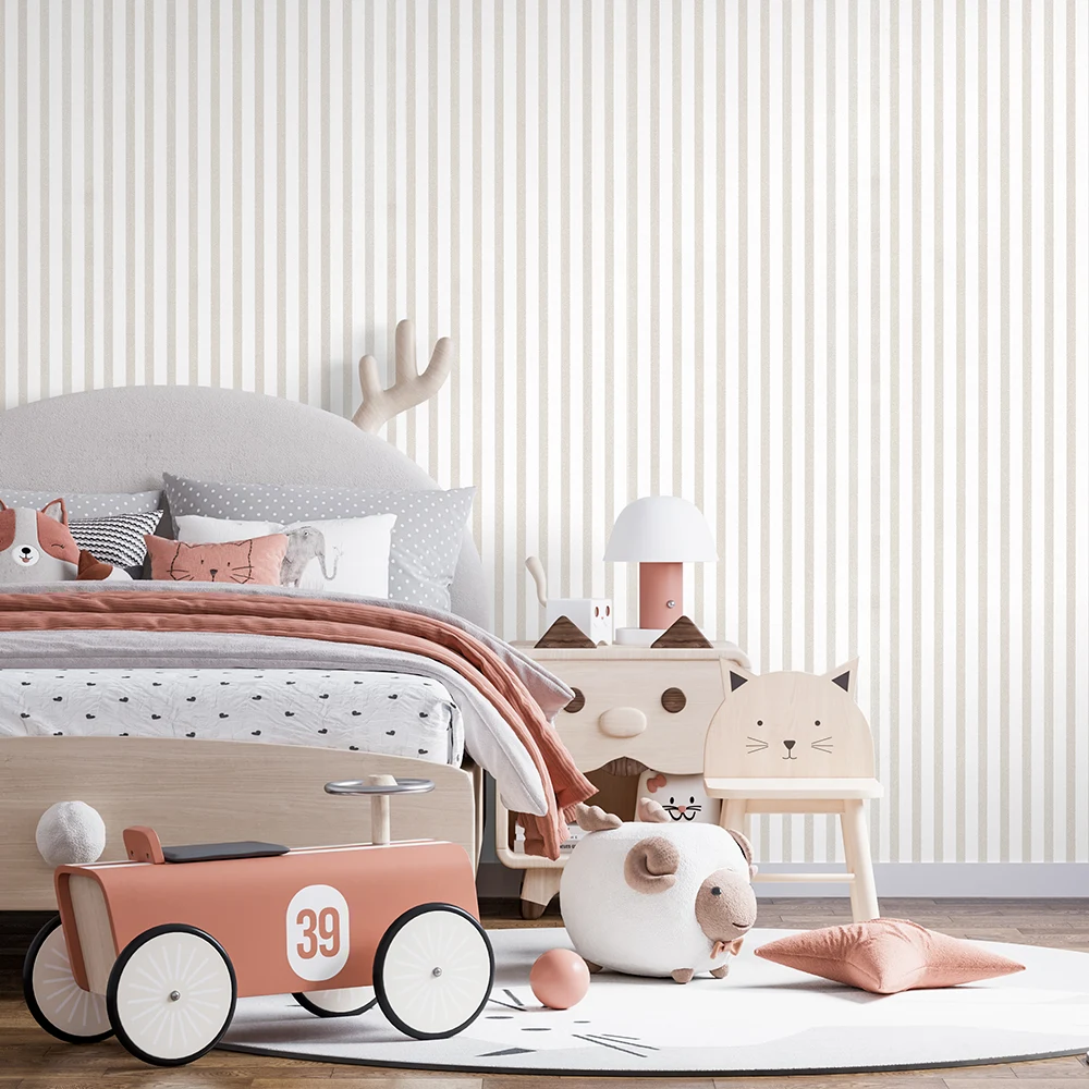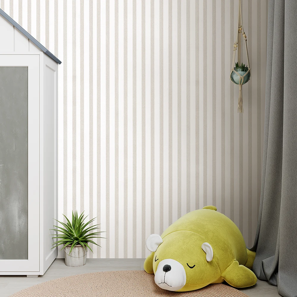 کاغذ دیواری کودک کد 12047 با خطوط راه راه کرم نخودی روی پس زمینه سفید، انتخابی گرم و دلنشین برای اتاق کودک است. این ترکیب رنگی ملایم، فضایی دنج و صمیمی در اتاق کودک شما ایجاد کرده و با هر نوع سبک دکوراسیون و سرویس خوابی ست و هماهنگ می‌شود. خطوط عمودی روشن، ارتفاع بصری فضا را افزایش داده و اتاق را دلباز و روشن‌تر نشان می‌دهند، در حالی که سادگی طرح، امکان اضافه کردن عناصر رنگی و تزئینی متنوع بدون ایجاد شلوغی را فراهم می‌کند.