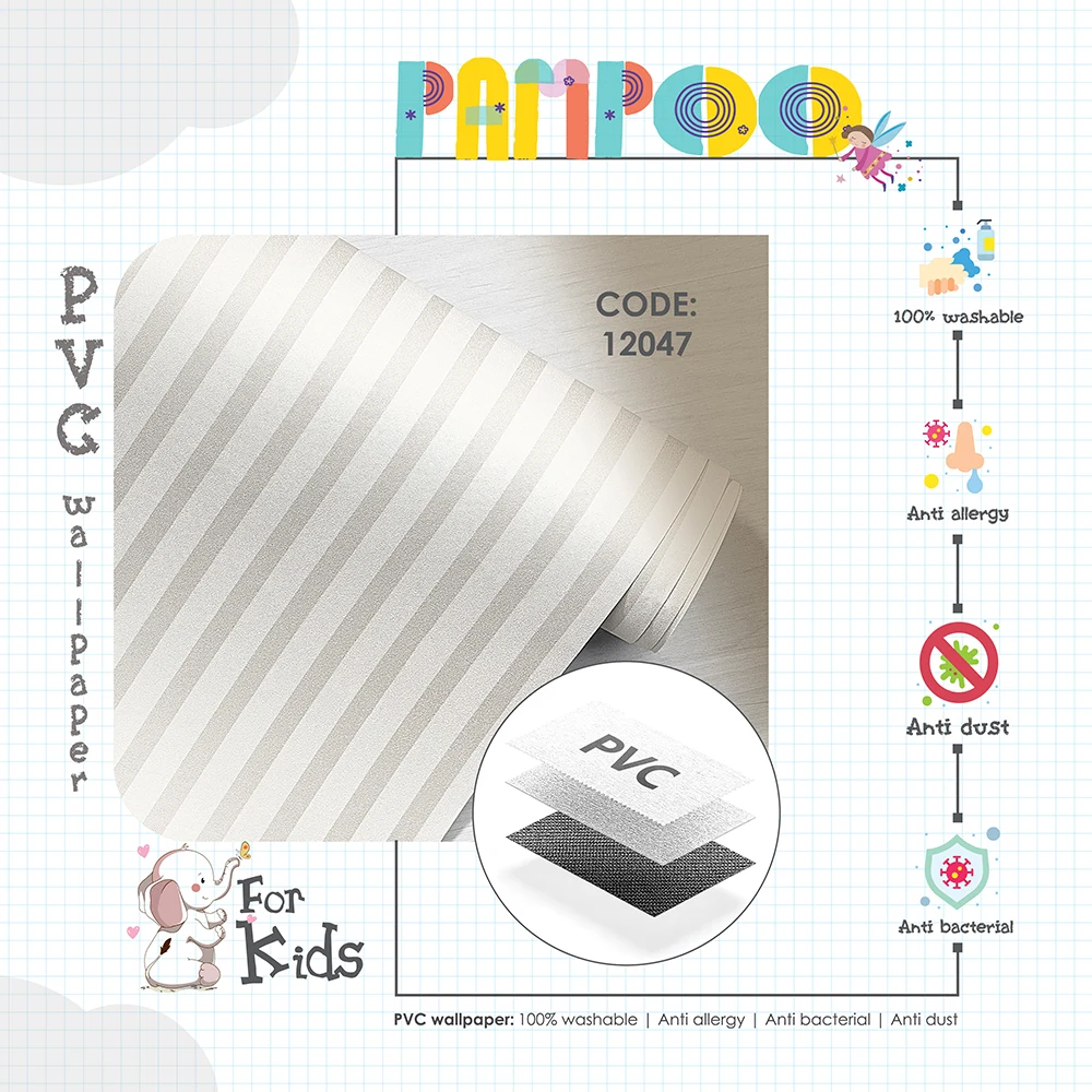 آلبوم کاغذ دیواری کودک پمپو، مجموعه‌ای صد در صد وینیل (PVC)، قابل شستشو، ضد حساسیت (آنتی آلرژی)، ضد گرد و غبار (آنتی داست)، و مقاوم و بادوام در برابر انواع لکه‌ها و آسیب‌هاست؛