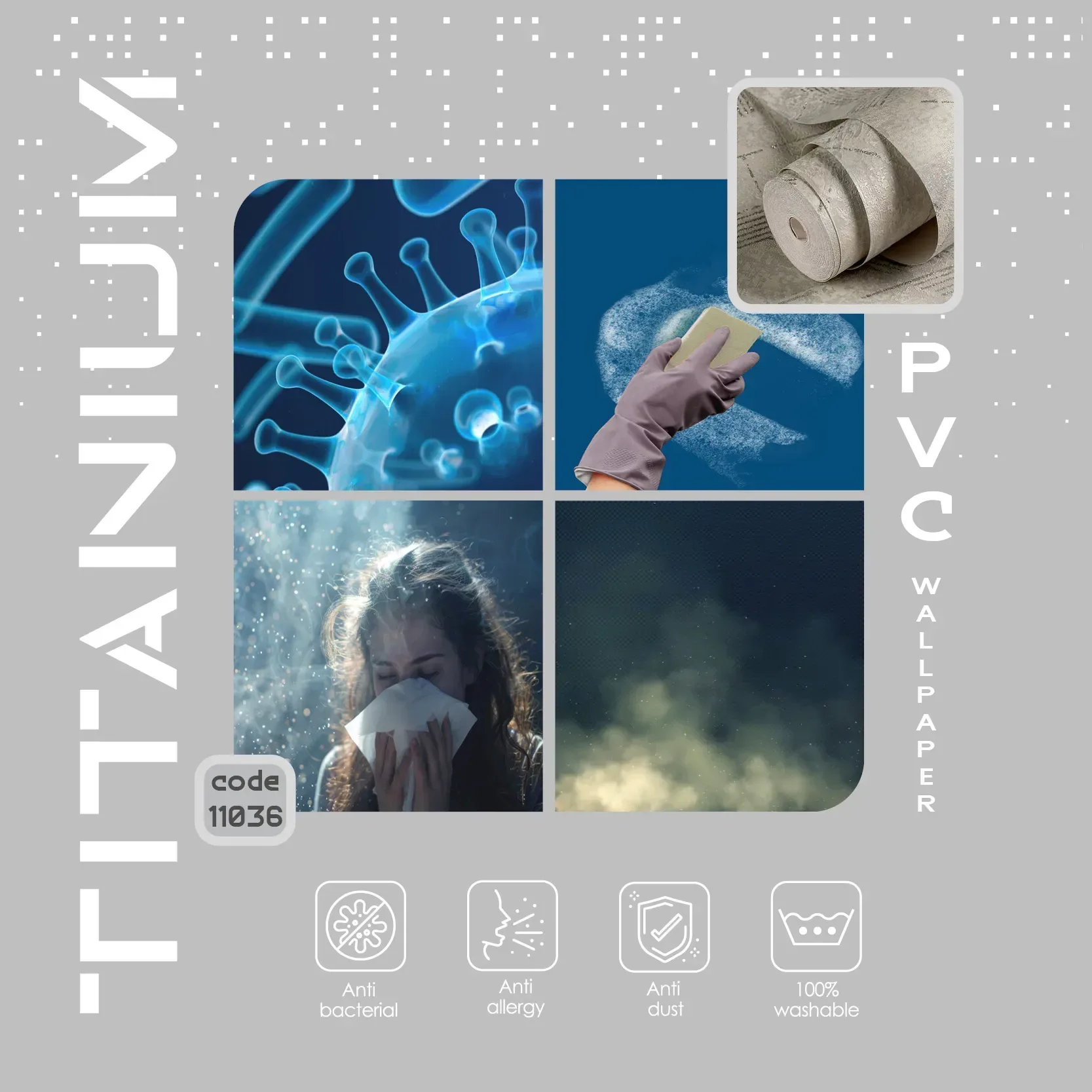 این محصول از جنس PVC (وینیل) ساخته میشود، قابلیتی که کاغذ دیواریهای PVC (وینیل) دارند دوام بالا و قابلیت شستشوی آنهاست. داشتن یک لایه زیرین، یک لایه فیبر یا کاغذ در میان و یک لایه پوشش نهایی باعث دوام بالای این دسته از کاغذ دیواریها میشود.